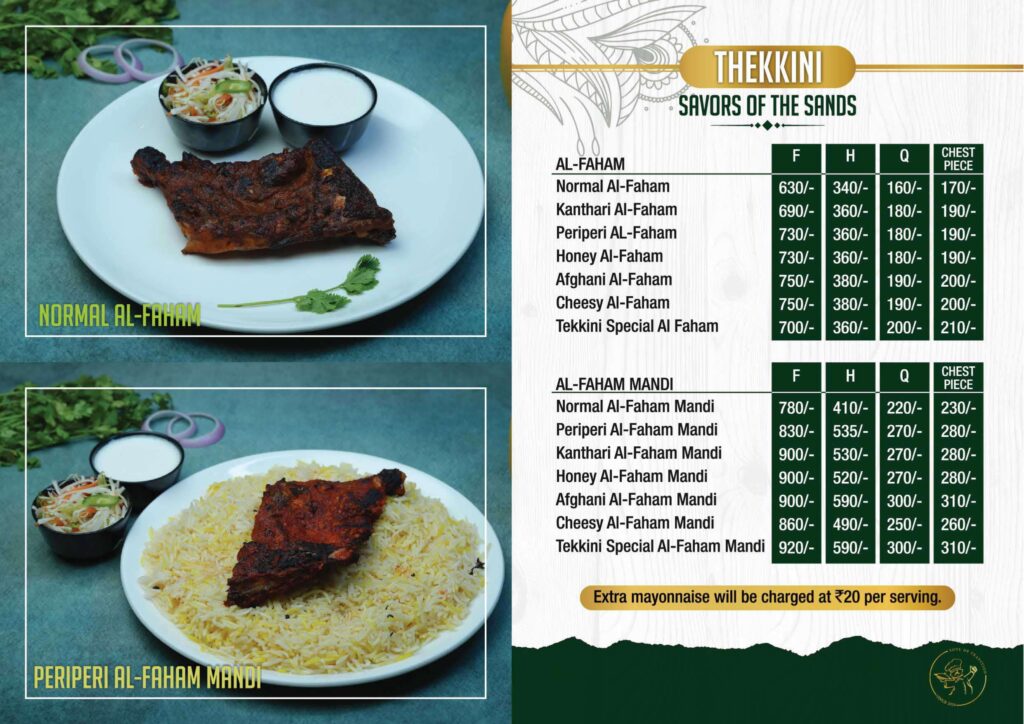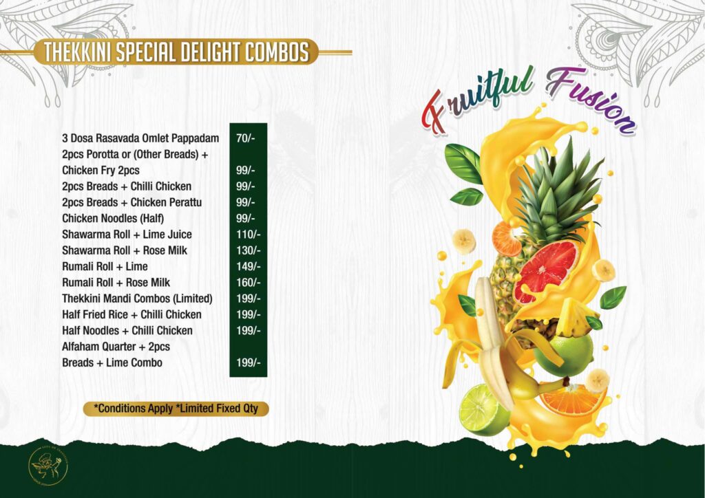 Welcome to the Thekkini Restaurant Menu, your gateway to authentic Kerala flavours, Arabian grills, traditional mandi, shawarma, and a wide range of multi-cuisine delicacies. Our menu is crafted to offer a perfect blend of taste, freshness, and premium dining experience for families, friends, and food lovers across Trivandrum.
